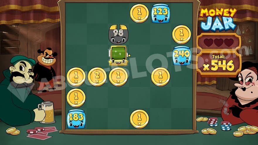 Landing 3 or 4 Money Jar Scatter Symbols anywhere will trigger this feature. The game starts with 3 lives, and each spin reduces the life meter by 1. Landing a casino chip with a heart on will reset the Live Meter to 3 lives, and the game ends when the player runs out of spins. The money jars that activate the feature stay on the grid while all other positions spin, with the outcome of landing blanks, coins, or some of the feature’s special symbols. The money jars collect all adjacent coins on each spin and move to new positions before the next one. They also collect each other’s values if they’re adjacent. The Extra Life symbol doesn’t have to be adjacent; it will reset the spins to 3 wherever it lands.