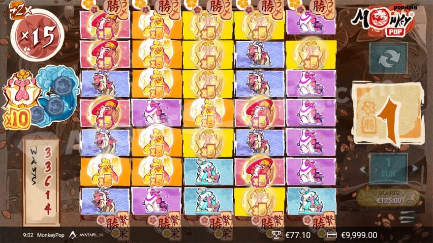 MonkeyPop is a video slot from Avatar UX that features 5 reels and 3 to 7 rows. This variation in the number of rows is due to the game's PopWins mechanic that can result in up to 33614 ways to win. You can choose between making a Min.bet of 0.20 and a Max.bet of 100. There is a higher-than-average RTP, where in this slot we have an RTP of 96.33%. MonkeyPop has a high volatility and a hit frequency of 22.62%, where you can win up to 14,240X the bet.