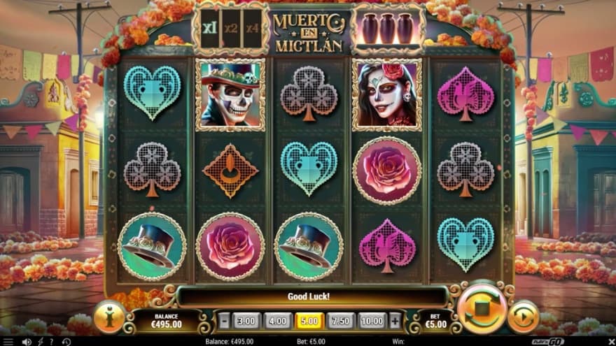 The game's design consists of a day of the dead theme, where we visit the place Mictlán, which the dead end up in when they die. In the background of the reels, you can see a floral and colorful street. It is a very detailed environment where the background is skillfully created with lovely color choices and small details. This also accompanies the reels, where you can see very beautiful symbols within this day of the dead theme. You can play this slot on all the device’s mobiles, desktops and notepads. You create a winning combination by landing 3 or more of the same symbol types on adjacent reels starting at the far left.