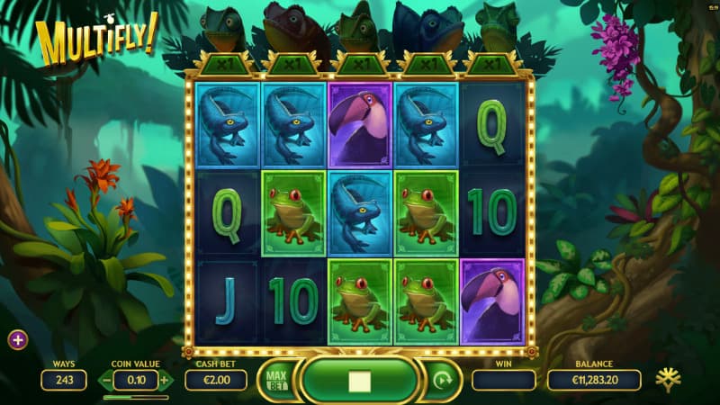 In this slot you get to experience a very green and beautiful environment in the deep forest. On top of the game's reels you can see the different multipliers that you can take part in and above these is a chameleon on each reel. These are hungry for fireflies and the more of these they eat, the higher your multiplier will be. We go into more detail with this a little further down in this review. Here you get to take part in a variety of wonderful symbols. Where the lower paying symbols are 9, 10, J, Q, K and A. The higher paying symbols are various tropical animals such as lizard, frog, toucan bird and parrot. There is also a wild you can take part in and it replaces all other symbols in the usual order except the game's scatter symbol. Yes, scatter symbol is needed to succeed in the game's free spins feature. Where the scatter symbol is a yellow chameleon.