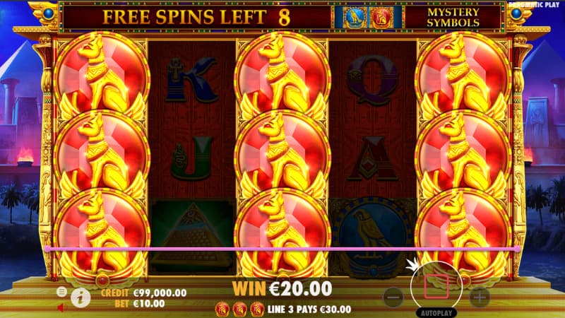 Egypt is truly a fascinating and mysterious place, where a multitude of mighty buildings as well as symbols with underlying meanings exist. Fortunately, we have gained some clarity in what this Egyptian slot has to offer. Here you can succeed in picking up a maximum win of 5602X the amount you have bet. This will be possible through a combination of Mystery symbols, Wilds, High paying symbols and the freespins feature.