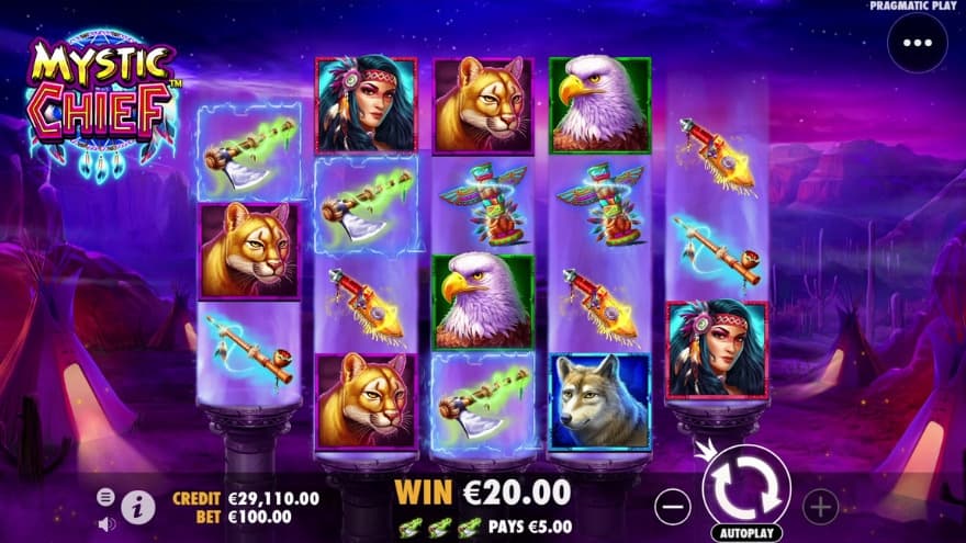 Mystic Chief is a video slot from Pragmatic Play that has 5 reels and a reel setup of 3-4-4-4-3. This setup results in 576 ways to win and you can choose between making a Min.bet of 0.20 and a Max.bet of 100. Something that has become increasingly common in slots from Pragmatic Play, is that the RTP can vary. It is an RTP of 96.55% by default, but always make sure to check with your gaming operator before you start spin the reels. It is a high volatility, where you can win up to 5000X the bet.