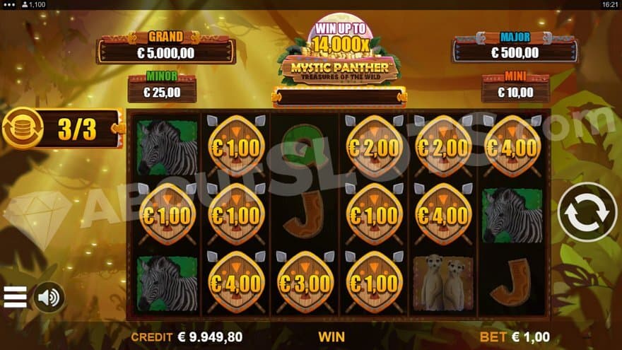 We’re in the jungle with trees and leaves in the background and some sunlight that seeps through the thick vegetation. The reels are dark and transparent, showing some parts of the background. On top of the reels is the game’s logo with the mystic panther looking at the player, slowly turning his head back and forth. To the side of the panther are displays of the 4 jackpots, or Bonus Prizes as they are called here. The bonus prize feature uses the Link&Win mechanic, which is also used in Gold Collector: Diamond Edition, and Links of Fire, to name a few. There’s also a Link&Win meter under the logo, sitting on top of the reels. On the meter are shields collected that can trigger the Link&Win feature. To make a win, you need to land at least 3 of the same symbol on adjacent reels, starting with the first reel to the left. The game can be played on desktop, notepad, and mobile phone.