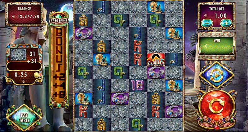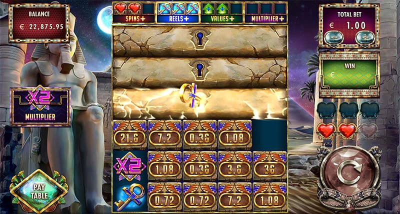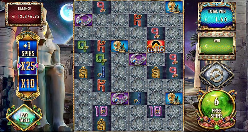 In Nefertiti’s minigame you are welcomed with 3 free spins and each time a new symbol lands, the number of free spins is reset to 3 again. You start spinning with 5 reels and 3 rows, whereby landing key symbols you can manage to unlock and get 6 rows in total. Here, the spins that are made are really very exciting to do as by landing multipliers, extra spins, extra reels and increasing values, you can get really big wins. This feature continues until you have either filled all positions with symbols or run out of spins.