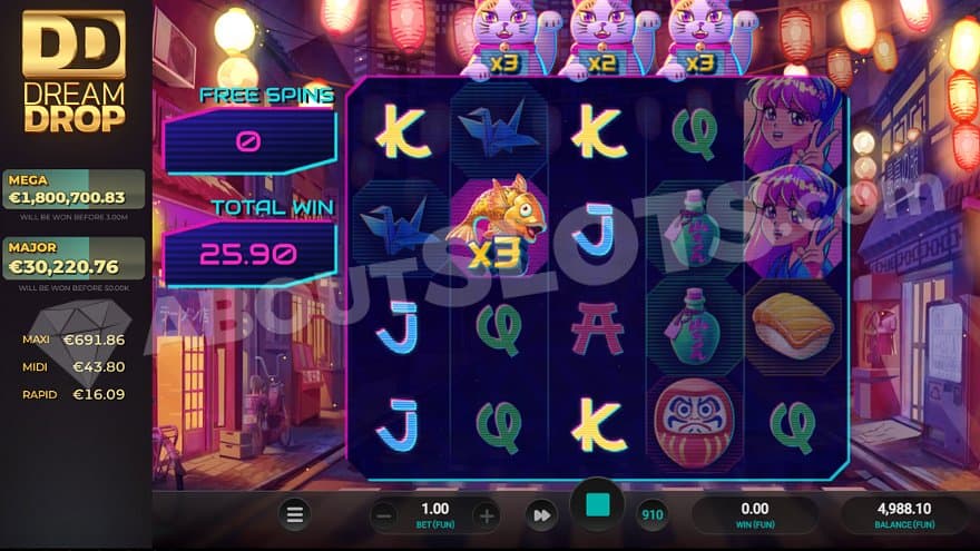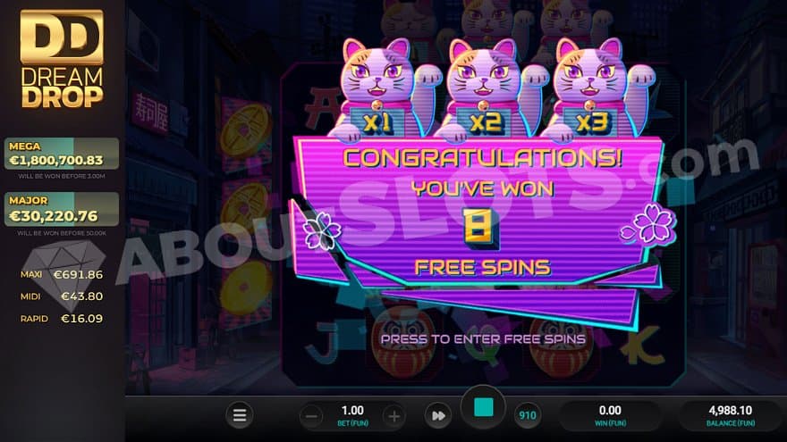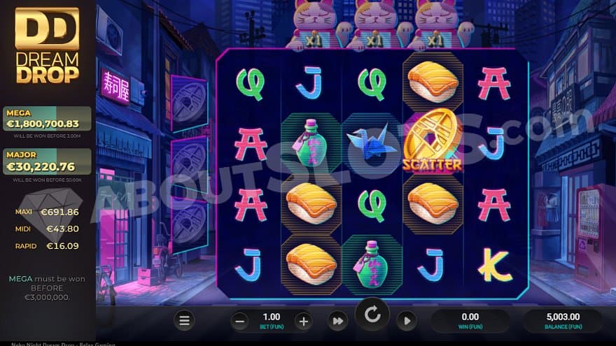 The Jackpot Spin can trigger randomly on any spin and is played before the regular spin. The feature can be activated on any bet, but the chances are bigger the higher the bet. The player will get one spin with the possibility to land blanks or Neko DD Symbols, depicted by the maneki-neko cats. If you manage to land 5 Neko DD Symbols – one on each reel – you activate the Dream Drop Bonus Jackpot. If not, you’re taken back to the base game.