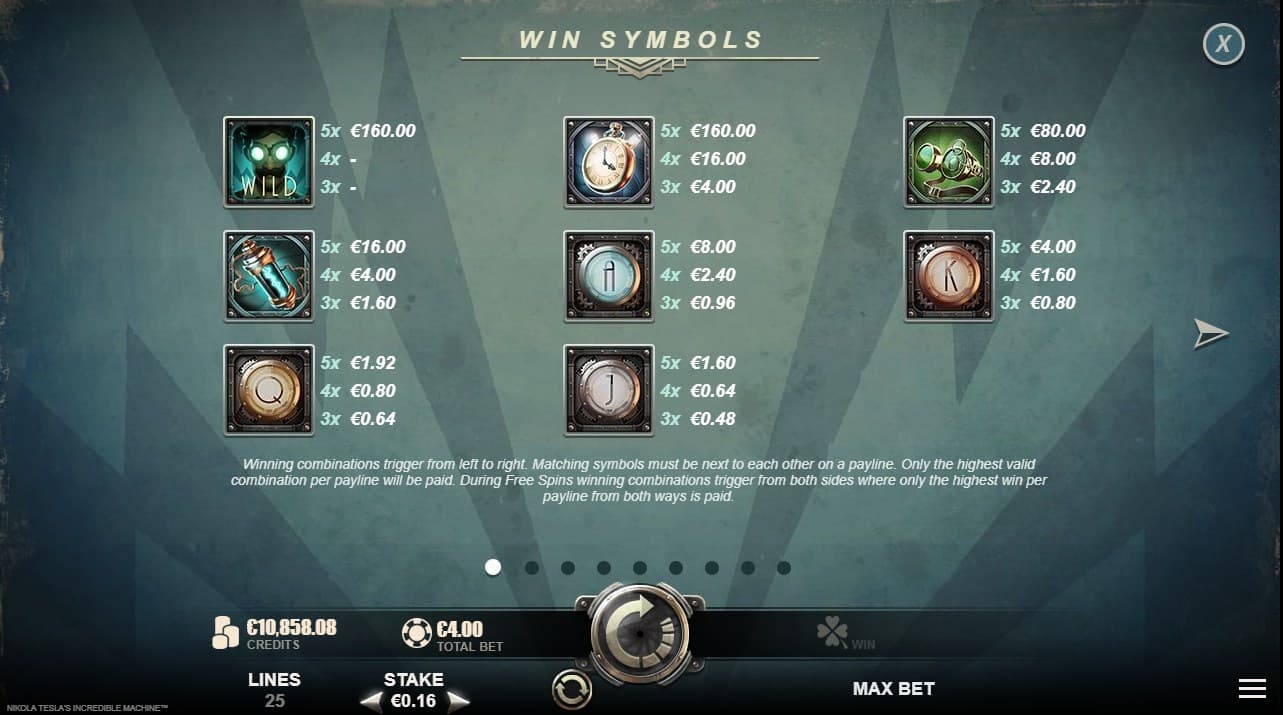 The Nikola Tesla’s Incredible Machine slot also features a Free Spins bonus which activates with three or more scattered bonus symbols landed on the reels on the same spin. This bonus feature brings up to 12 free spins while players can also enjoy wins pay both ways gaming engine. Moreover, before the initial free spins, one fixed wild symbol lands on the third reel while extra fixed wilds may land throughout the bonus feature.