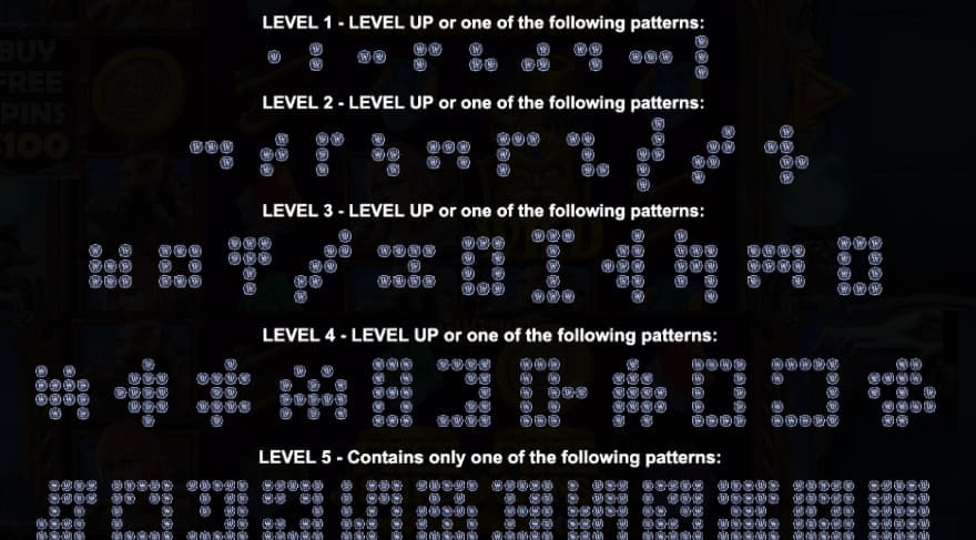 During your spins within the base game, you will see two halves of a square. These move to new positions with each spin and if you manage to land them so that they form a complete square, the Wild Patterns Wheel is activated. Then a wheel to the right of the reels will start spinning where it can land on a wild pattern or level up. If you land on a wild pattern, the current pattern will be placed out in a random position on the reels, where these positions will turn into wild symbols. If you land on the level up instead, you'll take part in a new spin, where better wild patterns can land. You can take part in up to 5 different levels with different patterns, as you can see in the picture below. Within the base game, the level is randomly selected to start with, while within the bonus game it always starts at level 1.