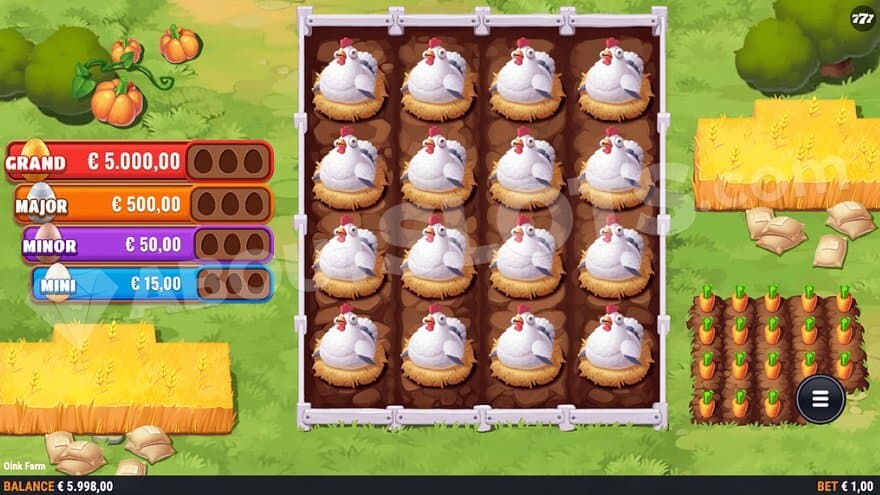 The Eggs Rush feature can be triggered on any spin. It takes you to a 4X4 game board with hens brooding on eggs. Your job is to click on a hen to reveal what kind of egg is under it. The eggs contain the Mini, Minor, Major, or Grand prize. This is how much they are worth: