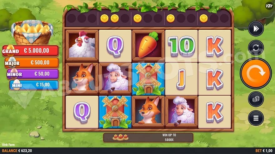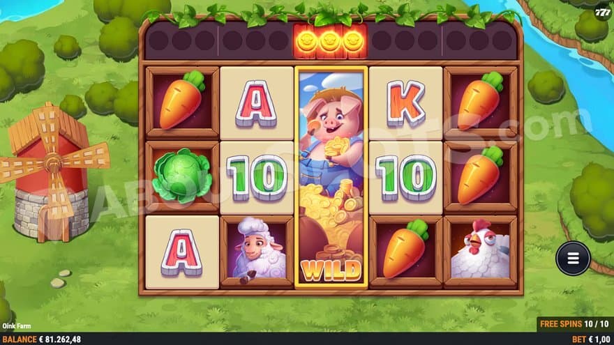 The lower-paying symbols on the farm are the classic slot symbols taken from a card deck: 10, J, Q, K, and A. Landing 3 of any of them will award the player 0.2X-0.4X the bet, and a combination of 5 is worth 1.5X-3X. The higher-paying symbols are carrot, cabbage, chicken, sheep, and fox. They pay 0.60X-1X the bet for landing 3, and a winline of 5 will give the player between 5X and 12.5X the bet. The Wild Symbol is the cheerful pig. It substitutes all mentioned symbols and also pays on its own, up to 20X the bet for a win of 5 symbols. Landing 3 Scatter Symbols, depicted by a windmill, will give you 10 free spins, and landing 3 Oink Coins on a reel will turn the reel wild for the coming 3 spins.