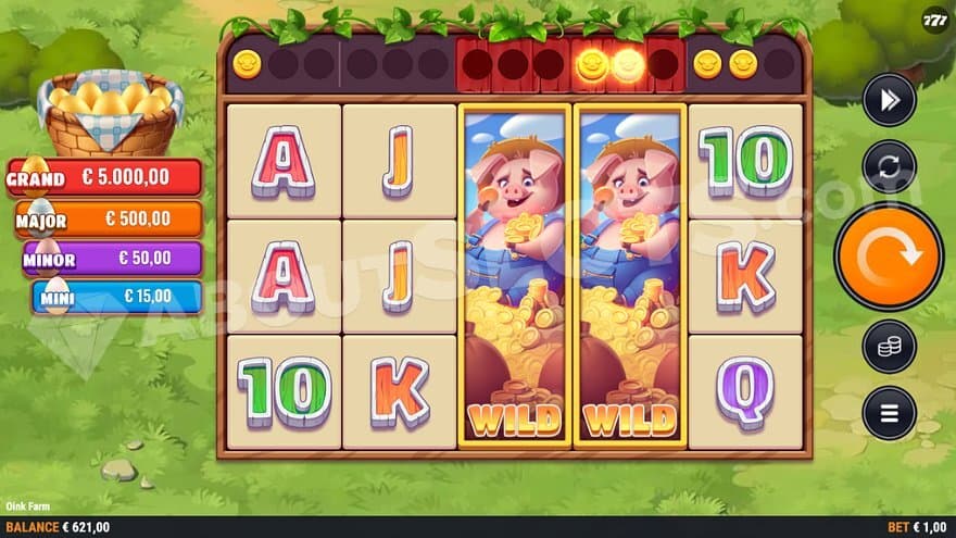 The Oink Coin can land on any position. It is added to the Oink Coin meter on top of the reel where it lands. The meter is full when a third coin hits it, starting the Wild Reel feature.