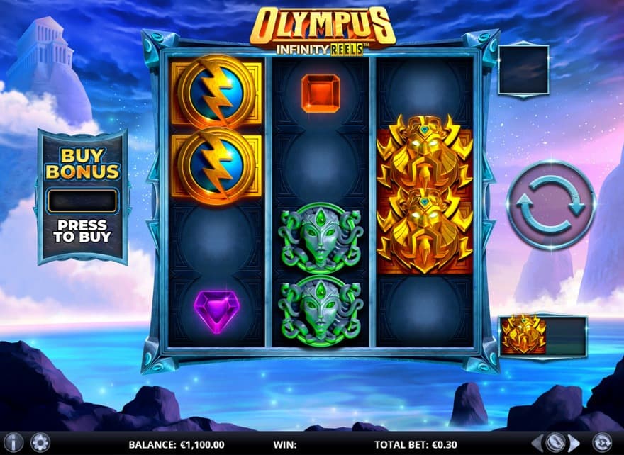 What features are in the slot Olympus Infinity Reels? The features are Infinity Reels, Frenzy Spins, Free Spins, Gamble and Bonus Buy.