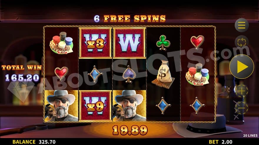 Whiskey bottles can appear on reels 2, 3, and 4. Revealed whiskey bottles and sheriff badges award one respin. Landing 1, 2, or 3 whiskey bottles awards a multiplier of 3X, 6X, or 9X the bet. The whiskey bottles are wild, substituting all regular paying symbols.