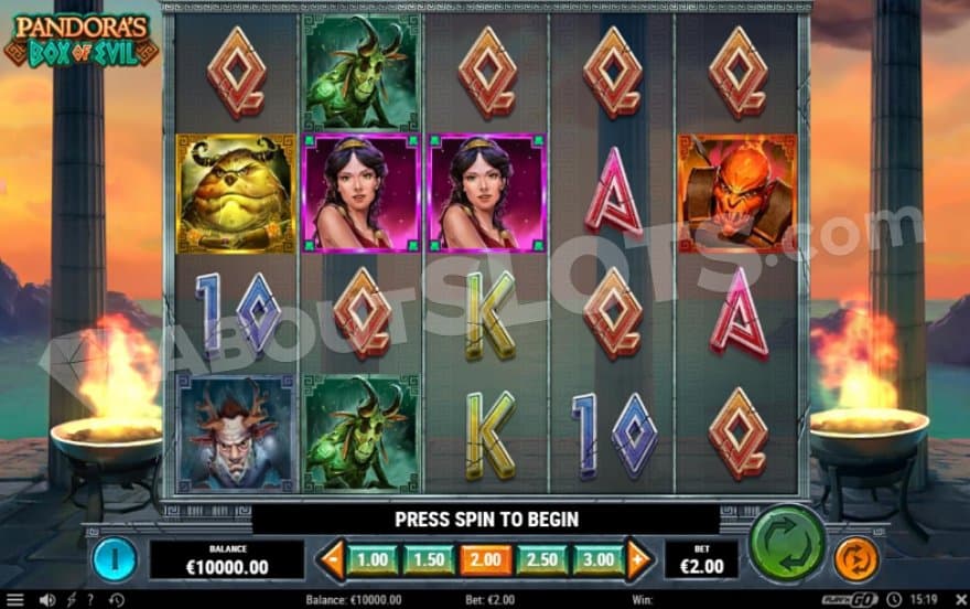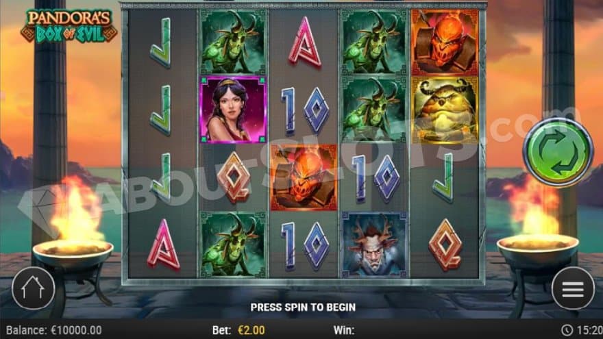 We're at a beach, probably in Greece or maybe in some divine universe. Two fires are burning to the side of the reels, and two pillars are shooting up in the sky. Some cliffs stick up in the greenish water, and the sky is yellow and red like the sun is about to set or rise. The five semi-transparent reels have a metal frame. You make wins by landing the same kind of symbol on any of the paylines, going left to right, starting on the first reel to the left. Pandora's Box of Evil is available on mobile phones, notepads, and desktop computers.