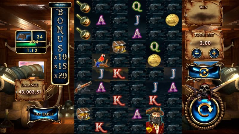 In the middle of all the cannons and their cannonballs, a giant slot has ended up. Where it has 6 reels that each have an incredible 10 rows. Where during your spins you can succeed in landing a lot of symbols that follow the pirate theme. As lower paying symbols we have a gun, rum bottle followed by J, Q, K and A. As a medium paying symbol, we have a gold coin, a parrot and a treasure chest filled with gold. As a higher paying symbol, we have the mighty pirate himself. Here we can take part in wild symbols and these helps to create more winning combinations by substitute symbols. But no great treasure is found without a treasure map and the same applies here. The game's bonus symbol consists of this, a treasure map.