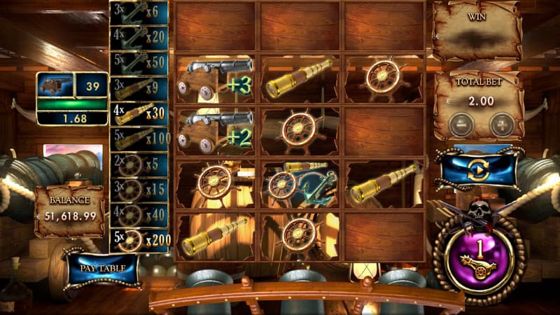 By collecting cannon symbols, you can succeed in activating the cannon minigame feature. Once inside, the cannons will be fired to show hidden symbols on the reels. Here you can by collecting the right amount of the different symbols, succeed in taking part in multipliers that will be able to increase the total win significantly.