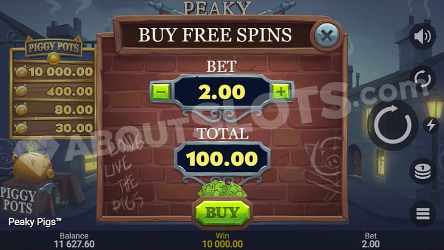 Peaky Pigs take place outdoors at night. The reels are put in the middle of a street, and to the sides are houses with smoke coming out of their chimneys. On top of the reels is the game’s logo with old-school machine guns and dynamites. To the left is a display of the different prizes in the Piggy Pots feature, and a piggy bank stands below. To make a win, the player has to land at least 3 of the same symbols on a payline going left to right. All wins must start at the first reel to the left, and the game is available on mobile phones, notepads, and desktops.