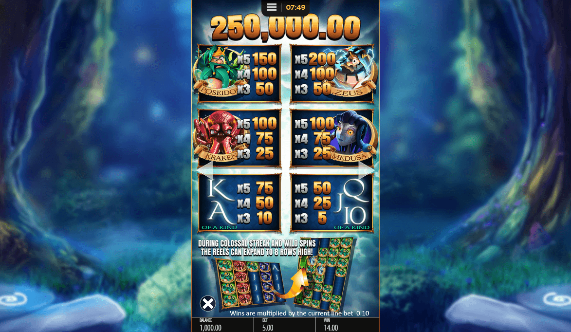Another great feature is the Colossal Streak feature that is activated when any symbol appears stacked on the first reel. This expands the grid by 4 more rows giving 80 paylines just like in the free spins round.