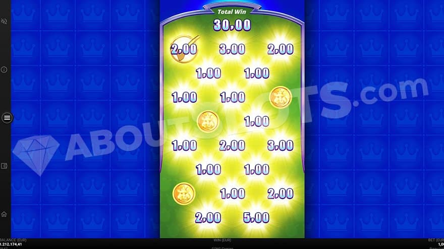 This feature is activated by landing 3 Jokers on reels 1, 2, and 3. You’re presented with 15 gold coins turned upside down, and you get to click on each coin, collecting its value until you choose a coin containing an arrow, which means that the feature is over. The max win in this feature is 39X the bet.