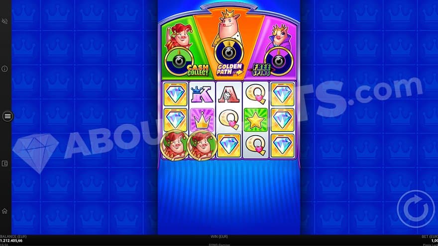 The Golden Path is activated by landing the King pig on reels 2, 3, and 4. It is the most valuable feature and will give you 10000X the bet if you go all the way. You will spin a wheel with the numbers 1-6, determining how many steps you’ll advance on the path. On every spin, the lowest number on the wheel turns to collect, and the feature is over when a spin lands on collect. The path has 36 steps, meaning that you need to land number 6 on all 6 spins to reach the end of the path and collect the 10000X win.