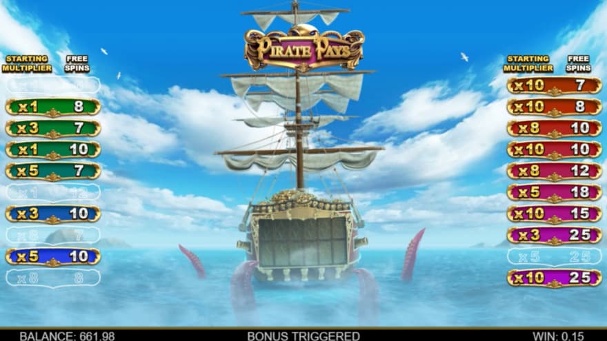 When you land 3 or more scatter symbols, the Kraken Bonus Round is activated. You will then be moved to a new location where 20 different options will appear, where each additional scatter symbol in addition to the first three will remove one of the options. Cannons will then blow away up 5 of these options, where you then get an offer that you can accept or choose to gamble for a hopefully better offer. You can continue to refuse offers until there are only 2 chests left and then you have to choose one of these and accept the offer that it contains. From the beginning of the feature, the different options show between 6 to 25 free spins and a starting win multiplier of between 1X to 10X.