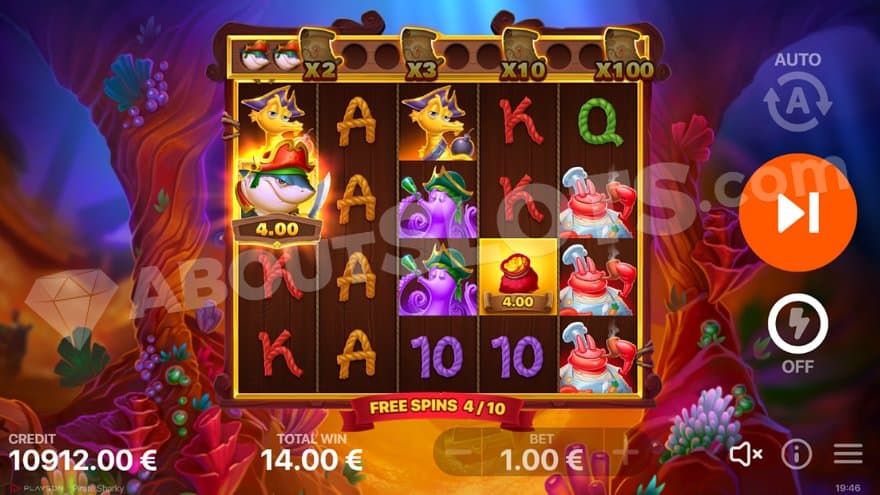 The lower-paying symbols at sea are 10, J, Q, K, and A, made out of rope. They all pay the same, giving the player 10X the bet for a 5-of-a-kind win. The higher-paying symbols are blowfish, octopus, seahorse, and crab. These guys will give you between 50X and 200X the bet. The main character, the pirate shark, appears on two symbols: Wild and Scatter. You will also find Money Bags with a cash value that can be collected in the free spins.
