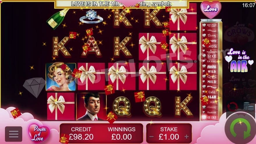 The Love Meter Feature Selector rewards one or two features in the base game and up to three features in the free spins when you have accomplished the Love Meter Test. The features are Love Grows, Love is In the Air, and Love is Popping Up. Landing Love Grows and Love is Popping Up guarantees you at least one of the other features too.