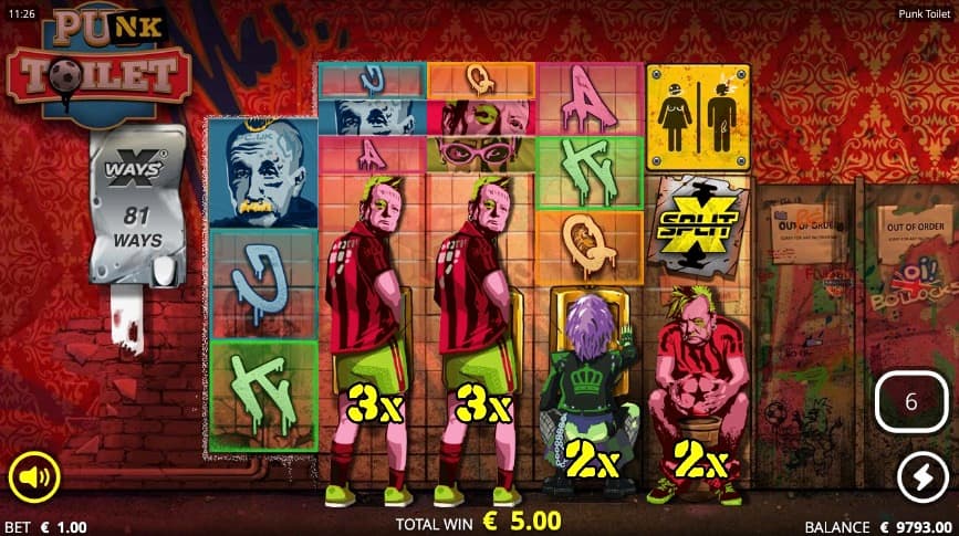 The design of the game is based on a punk theme, where the slot is set in a restroom. The background is adorned with drawings and a lot of graffiti, where two toilets turn out to be out of order. The other urinals and toilets, however, are in full swing, where things really are lively during the spins, where you can see famous icons like Winston Churchill and Albert Einstein with a heavy dose of punk applied to them, among others. There's a constant underground rock being played during the spins, where its tempo intensifies when bigger wins land on the reels. You can play this slot on all the devices mobiles, notepads and desktops. You create a winning combination by landing 3 or more of the same symbol type on adjacent reels starting at the leftmost position.