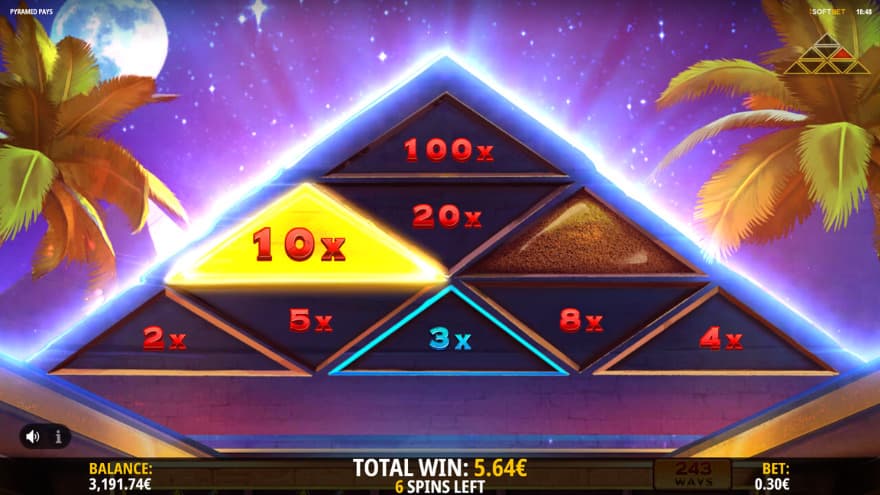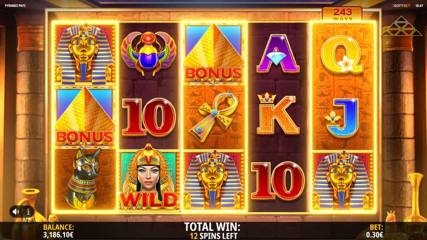 Pyramid Pays is a video slot from iSoftBet that has 5 reels, 3 rows and 243 ways to win. You can choose between making a Min.bet 0.30 and a Max.bet of 30. You are expected to get a win on every third spin made, as it is a hit frequency of 31.1%. The game's RTP is around average as it is an RTP of 96.00%. It is a medium volatility, where you can win up to 3840X the bet.