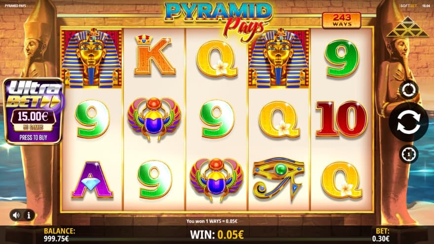The features are Wild Symbol, Free Spins, Pyramid Pays and Ultra Bet.