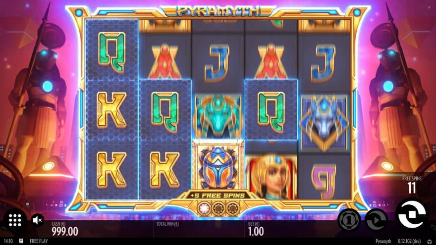 Pyramyth is a new casino slot from Thunderkick, where we get to join on a futuristic journey. To a place where the buildings in Egypt have been given a futuristic look and are surrounded by high-tech constructions. Since Egyptian themes are constantly recurring in slots, it feels very refreshing that the creative souls at Thunderkick have added a fresh touch to this otherwise well used theme. Although they play with the idea of a high-tech future, the Egyptians proved to be very innovative with their buildings back in time as well. Where they, among other things, used batteries that could light up dark passages within the pyramids.