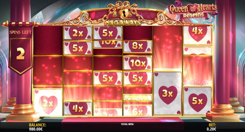 In this slot we can take part in both Respins and free spins. You succeed in activating the Queen of Wonderland Respins by landing 5 or more Respins symbols. These symbols show a heart card with a multiplier. These symbols that activated the Respins feature will remain on the reels and here you get 3 Respins.