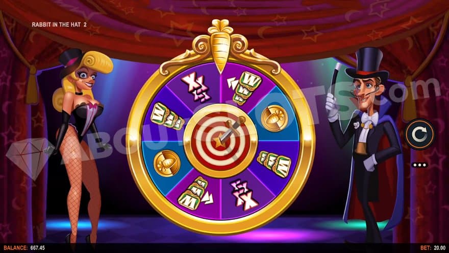 Rabbit in the Hat 2 is a video slot from Slingshot Studios with a grid of 5 reels, 3 rows, and 20 paylines. The betting range goes from the Min.bet of 0.2 to the Max.bet of 40. The game has a rather average RTP of 96.08% and high volatility. Scoring the max win will give you 5,000X the bet and the hit frequency of 27.67% means that over every fourth spin is a winner.