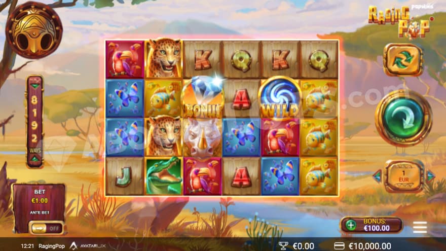 RagingPop is a new casino slot from Avatar UX, which takes us to the savannah of Africa. It's a place filled with wild animals and big treasures that can pay up to 20000X the bet. This PopWins series has certainly been trending since its release and recently we got to meet tranquil monkeys who love hot springs within the slot MonkeyPop. It was a slot that proved to be very explosive with its multiplier growth, but the potential maximum win has certainly been cranked up quite a bit within this release. Let's visit this site and find out what you can expect to see during the spins.