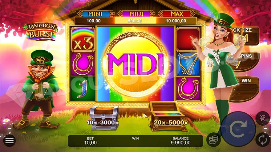 In the Rainbow Burst feature, players can collect a guaranteed Rainbow Prize. The feature replaces reels 2, 3, and 4 with a big reel. Possible Rainbow Prizes are Mini (10x the bet), Midi (50x the bet), and Max (1,000x the bet).