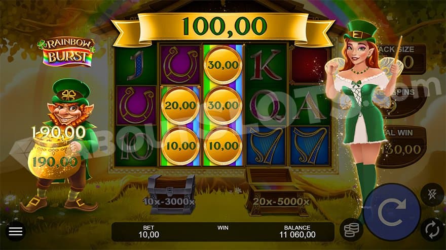 Leprechaun’s Vault, Lucky Leprechaun Clusters, and Gaelic Gold are just a few of all casino slots featuring the Irish folklore character leprechaun. This little green guy is said to have hidden his treasures at the end of the rainbow, and Rainbow Burst is even more focused on the optical phenomenon than other games in the genre. Here you’ll find features such as Rainbow Symbols, Rainbow Respin, Rainbow Chests, and Rainbow Burst.