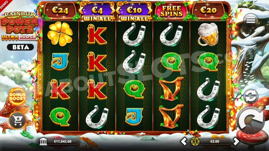 Within this Irish Christmas adventure, a plethora of exciting features is offered. The features are Wild Symbol, Power Potz, Ultranudge, Lots O’Potz Free Spins, Bonus Boost, and Bonus Buy.