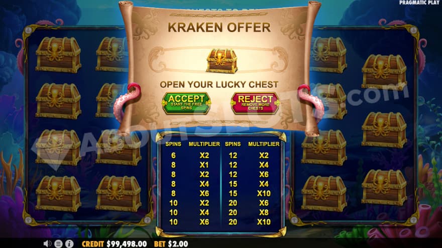 You will then be presented with 16 boxes and at the start, one box will be selected, but its value will not be revealed. You can then open this selected box and choose to either play with these conditions or gamble for a chance of better bonus game conditions. If you choose to gamble for better conditions, you will be prompted to click on the boxes, whereupon the Kraken will offer you a deal with free spins and multipliers based on the boxes you have clicked off.