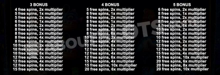 If you land 3 or more scatter symbols, the free spins feature is activated. Depending on how many scatter symbols you land, you will be able to take part in a mini bonus game with different conditions for a chance to obtain a better starting win multiplier and number of free spins. Below you can see the different outcomes you can obtain.