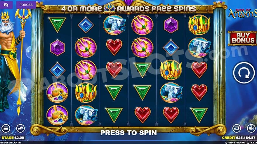 Rise of Atlantis is a new casino slot from Blueprint Gaming taking the player to Plato’s fictional island Atlantis. The island represents the antagonist naval power of Ancient Athens. Atlantis is said to have been submerged under water after falling out of favour with the Greek gods, and this game is located beneath the surface of the sea. You can forget totally about paylines because wins are made by landing 8 or more symbols anywhere on the screen. To help you is a water god – we’d guess it’s Poseidon – who shoots multiplying water bubbles on the reels, giving you great chances to score big. Are you ready to discover the submerged Atlantis?