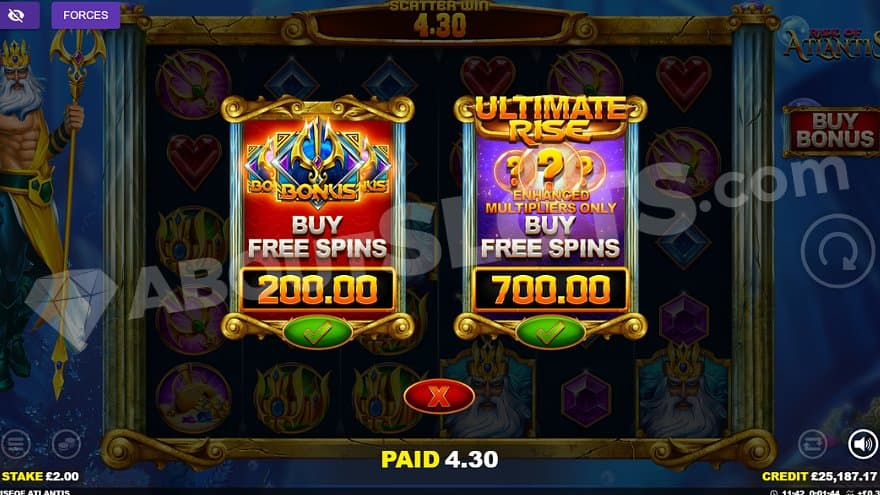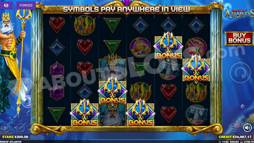 The Rising Multiplier can trigger randomly on any spin. The god next to the reels waves his trident creating one or several multiplier bubbles that land on top of other symbols. Each bubble can have a multiplier of up to 500X the bet. If any win is achieved, the multiplier will be used to multiply that sum at the end of a cascade. When all cascades are over, the multiplier will rise 1 position on its reel, where it’s used in the case of any wins in the next spin.