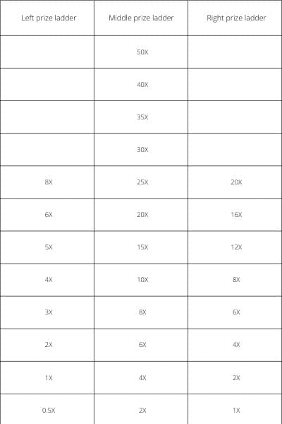 The left and the right prize ladders have 8 steps, while the middle one has 12. This is how much each step on the ladder pays.