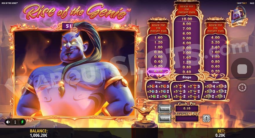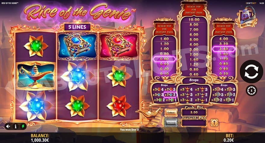 To the right of the grid are the 3 prize ladders, displaying how much every step pays. The game has 3 different symbols in 3 different colors. To make a win, you’ll need to land 2 or 3 of the same symbols with the same color on any of the 5 paylines. Three of the paylines run horizontally from left to right, and the other two run diagonally, from the top left corner to the bottom right and from the bottom left corner to the upper right. Every win on any of the three prize ladders is added together in a cash pot that the player can choose to collect at any time. Climbing the ladders will result in bigger and bigger wins, but if the Genie turns up on a spin, he will steal all the money in the cash pot. All prize ladders will be reset whenever the player collects the cash pot.