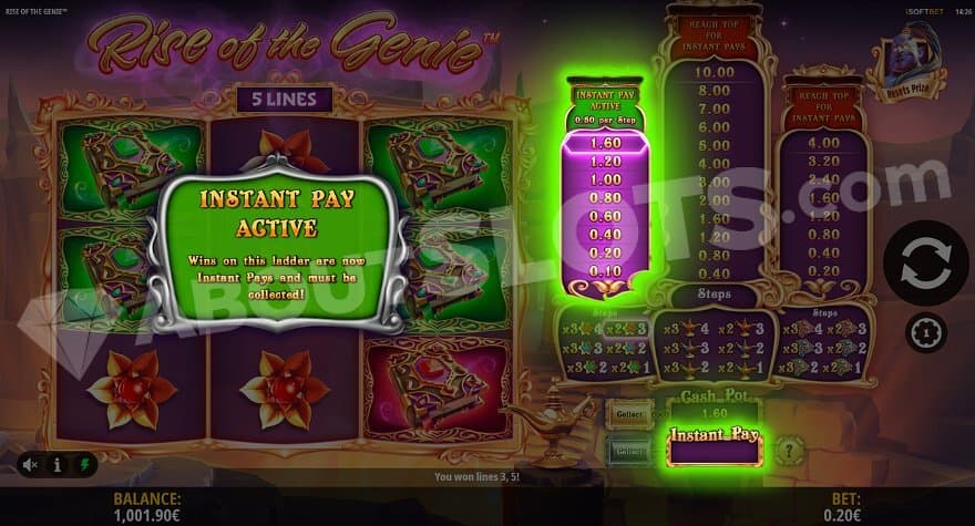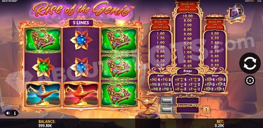 Rise of the Genie is a video slot from iSoftBet with 3 reels, 3 rows, and 5 paylines. Players can choose to bet from the Min.bet of 0.20 to the Max.bet of 20. The RTP is 96.46% for players who never collect their money from the ladders and 95.08% if the wins are always collected. Rise of the Genie has medium volatility and a max win of 500X the bet. The hit frequency of 24.8% means that about every fourth spin is a win.