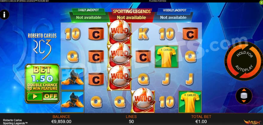 As a player, Roberto Carlos had many tricks up his sleeve, but this game is focused on relatively few mechanics. The features are Wild Symbol, Feature Bet Mode, Roberto Carlos Respin, and Sporting Legends Jackpot.