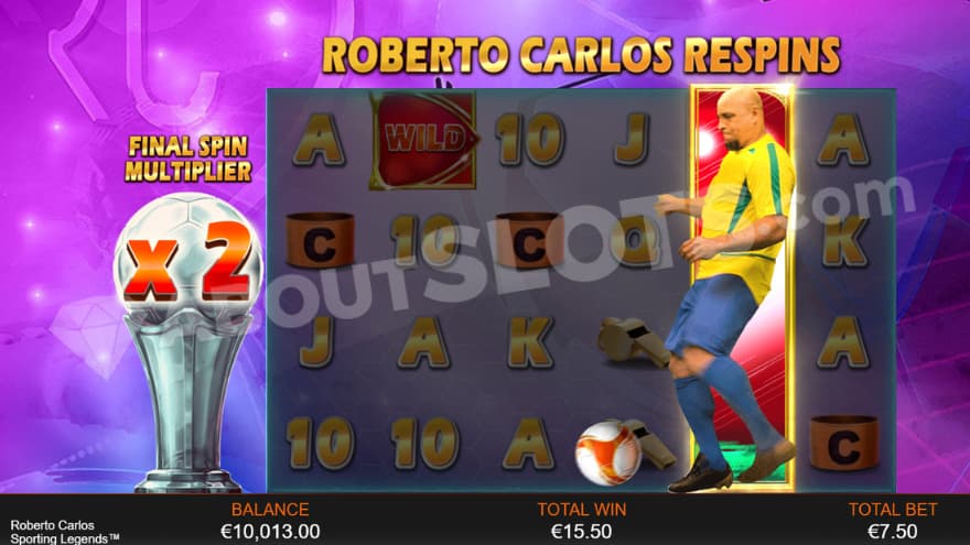 Activating the Feature Bet Mode increases the chance of triggering Roberto Carlos Respins. This comes at the cost of 1.5x the original bet.
