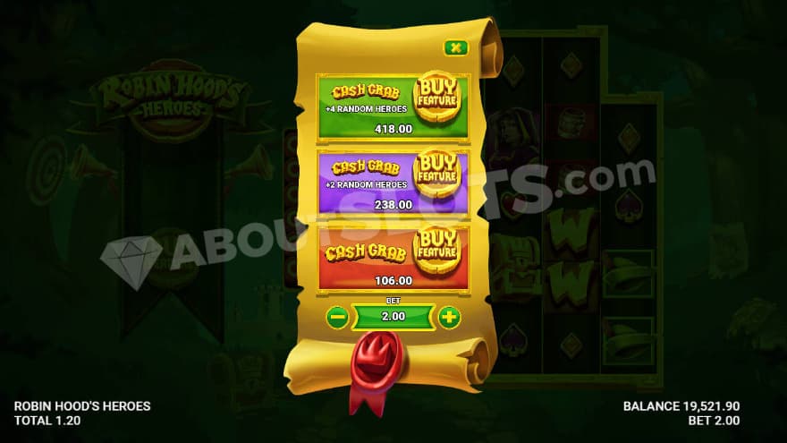 To help us steal from the rich, Robin Hood has made sure to provide a bunch of nice features. The features are Wild Symbol, Scatter Symbol, Cash Collect, Cash Grab, Wild Split, Free Spins, and Bonus Buy.