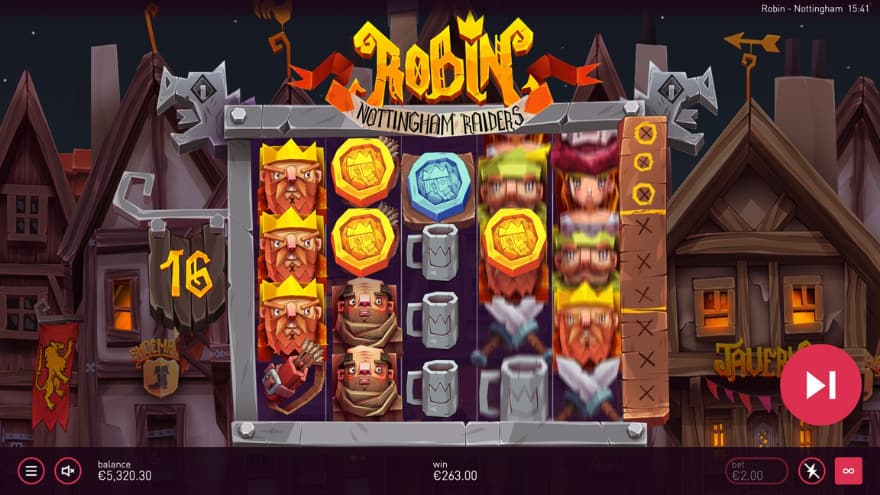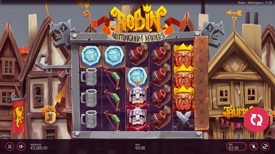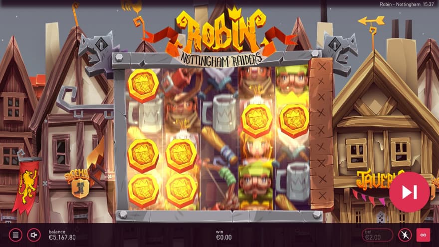 Robin Nottingham Raiders is a new casino slot from Peter & Sons, where we head to the medieval times and meet the greatest archer of all time. It is Robin Hood, known for stealing from the rich and giving to the poor. This time we get to follow Robin and his gang on a raid at the king’s castle, where it can give prizes of up to incredible 25,000X the bet.
