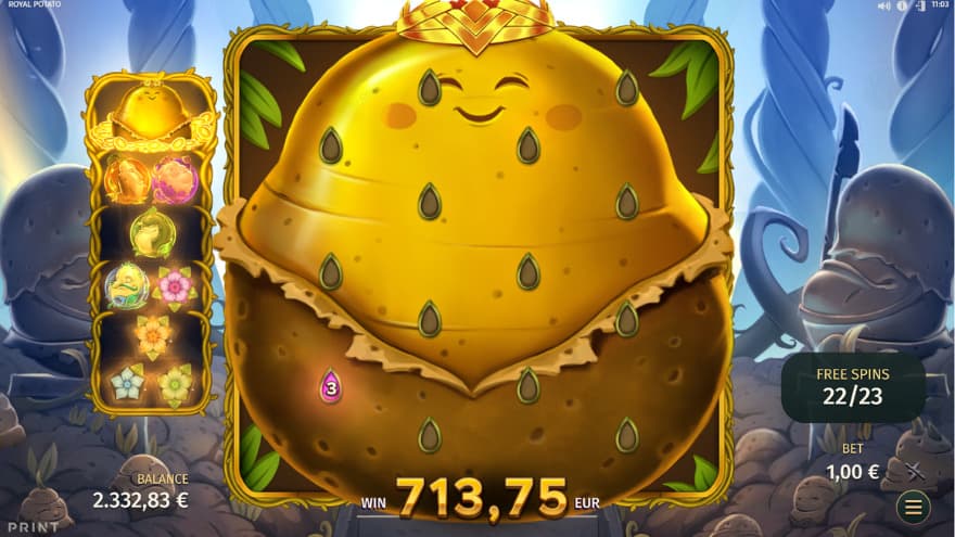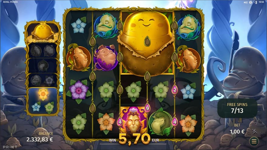 Print Studios may be new as a game provider, but they are once again showing a phenomenal class in game development that could be compared with the more established studios out there. We've recently been introduced to Book of Destiny which gave new life to a well-used expanding symbols mechanic with the help of innovative tweaks. Their latest Crystal Golem was the slot where we were first introduced to their SuperSpinners mechanic, which adds an extra golden touch to the spins being made. This time they have gone completely their own way and created a very entertaining theme with royal potatoes. They manage to stage this slot in a very elegant way, using clever design skills along with an atmospheric music. You get into a good mood very quickly when you click into this slot and with the help of the SuperSpinners mechanic, the adventure can start right away.