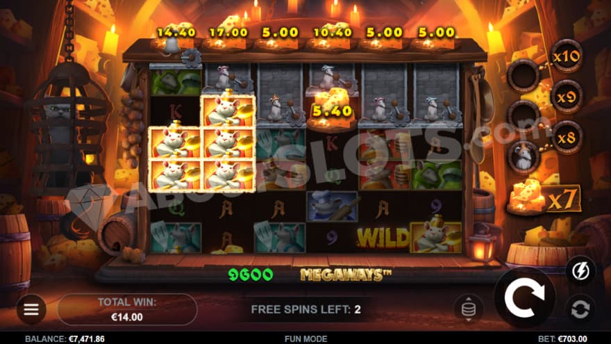 During the base game and free spins, platters of cheese will land on the reels and fill up the K-Cash meter on top of the reels. In the base game, you collect it if the cat shows up on a reel and smacks the rat.
