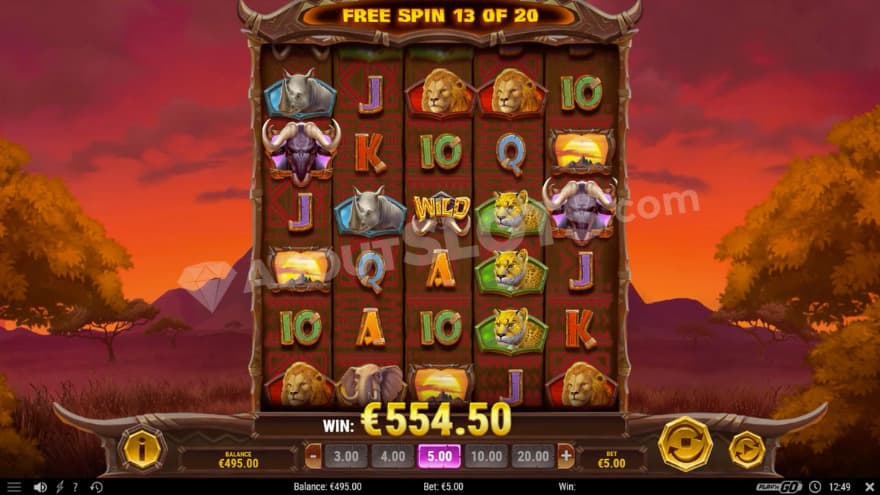 The lower paying symbols are 10, J, Q, K and A. Landing 5 of the same symbol type pays between 0.4X to 0.8X the bet. The higher paying symbols are the leopard, rhino, lion, elephant and buffalo. Landing 5 of the same symbol type pays between 3X to 10X the bet. The game's wild symbol is the tusks with the word wild on it and the scatter symbol is the giant sunset. Let's find out what the features do.